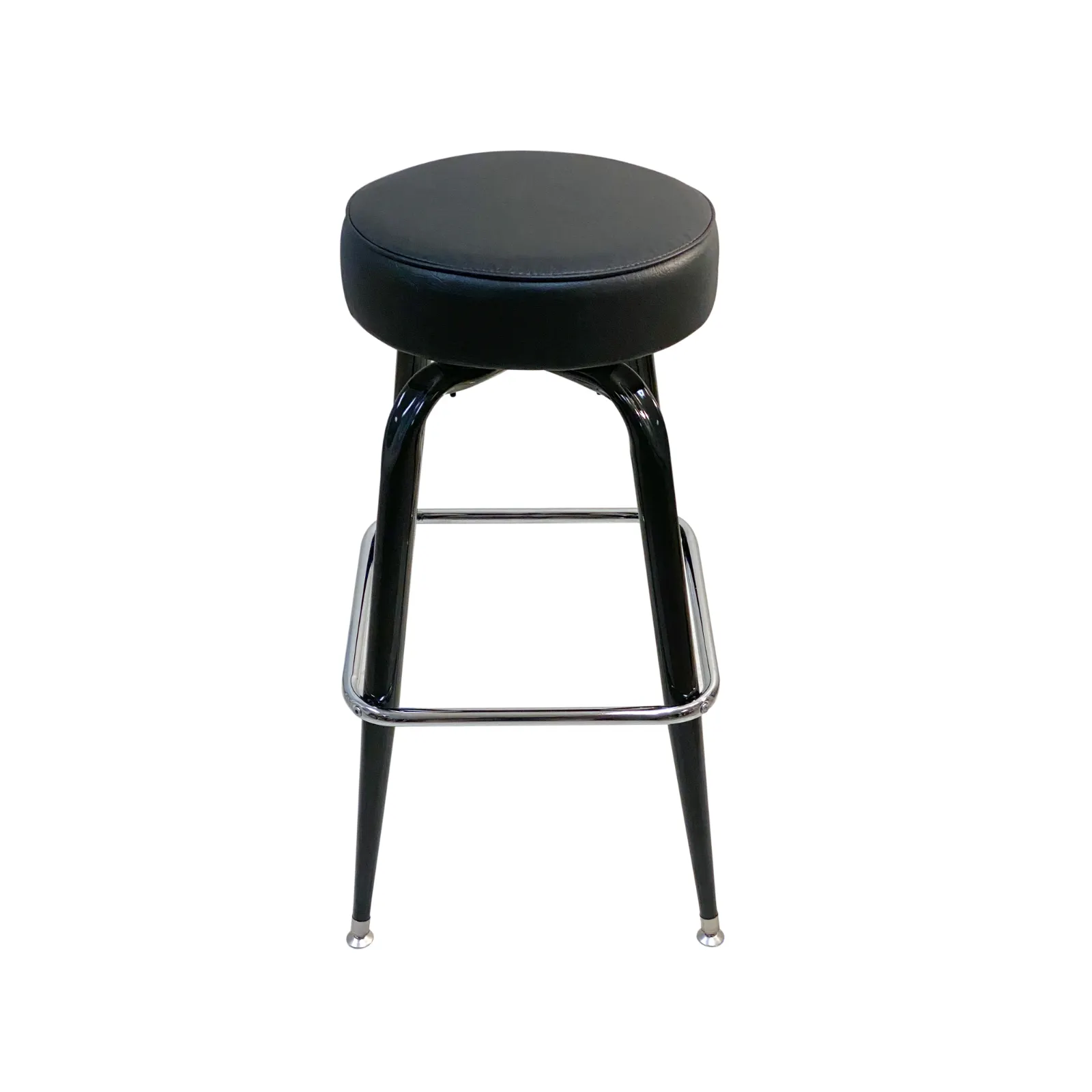 Bar Stool, 24″H, backless, upholstered seat, metal frame with glossy black finish, single square chrome footring, AAA vinyl, Quick Ship