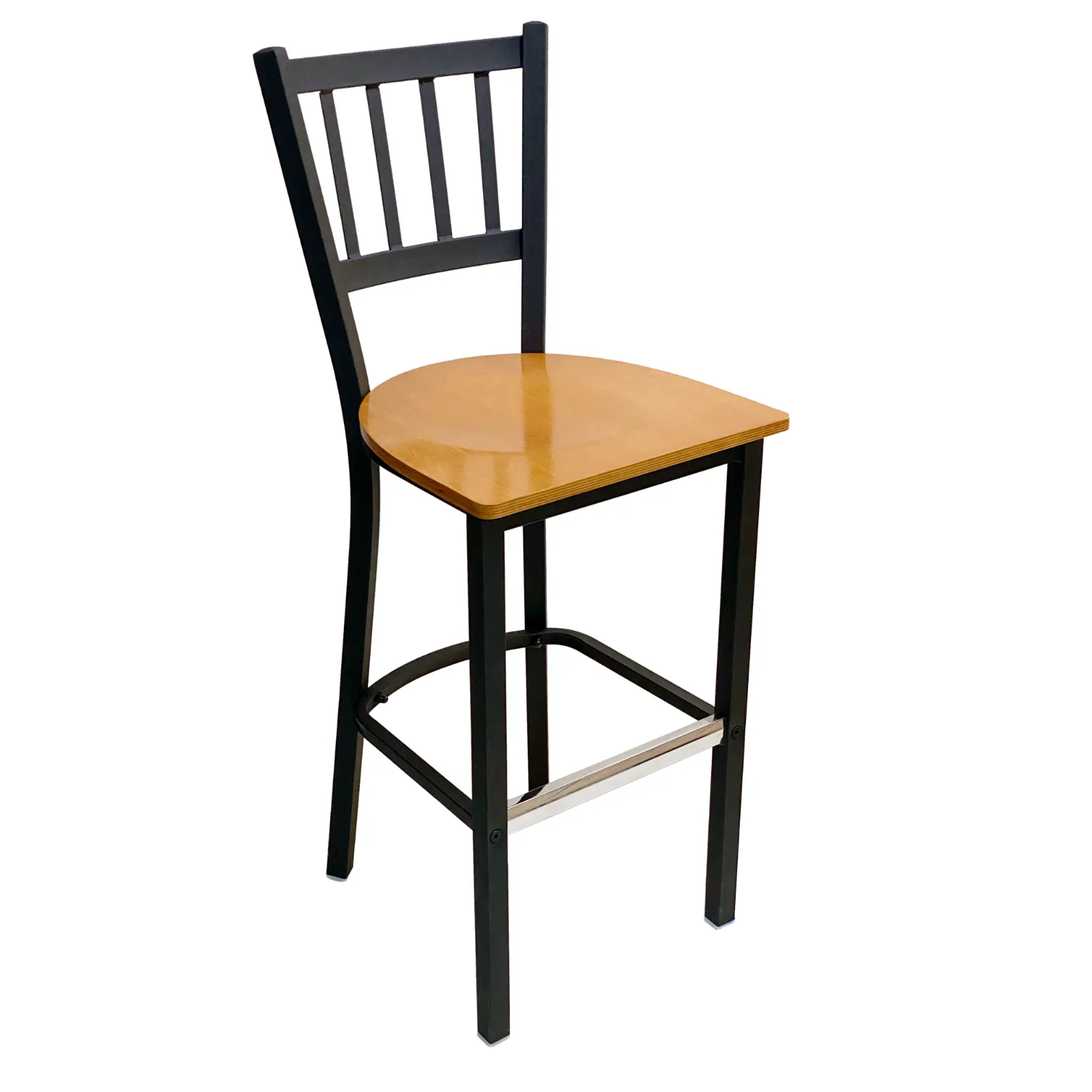 Bar Stool, slat back, wood saddle seat, footrest, metal frame with black finish, Quick Ship