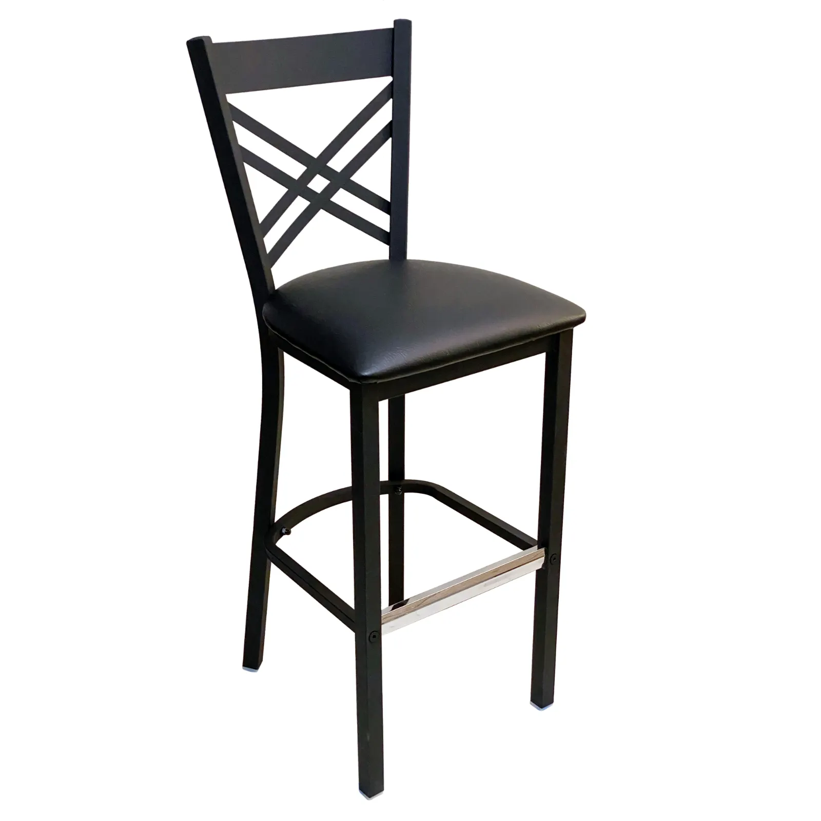 Bar Stool, criss-cross back, upholstered seat, metal frame with matte black finish, footrest, black vinyl, Quick Ship