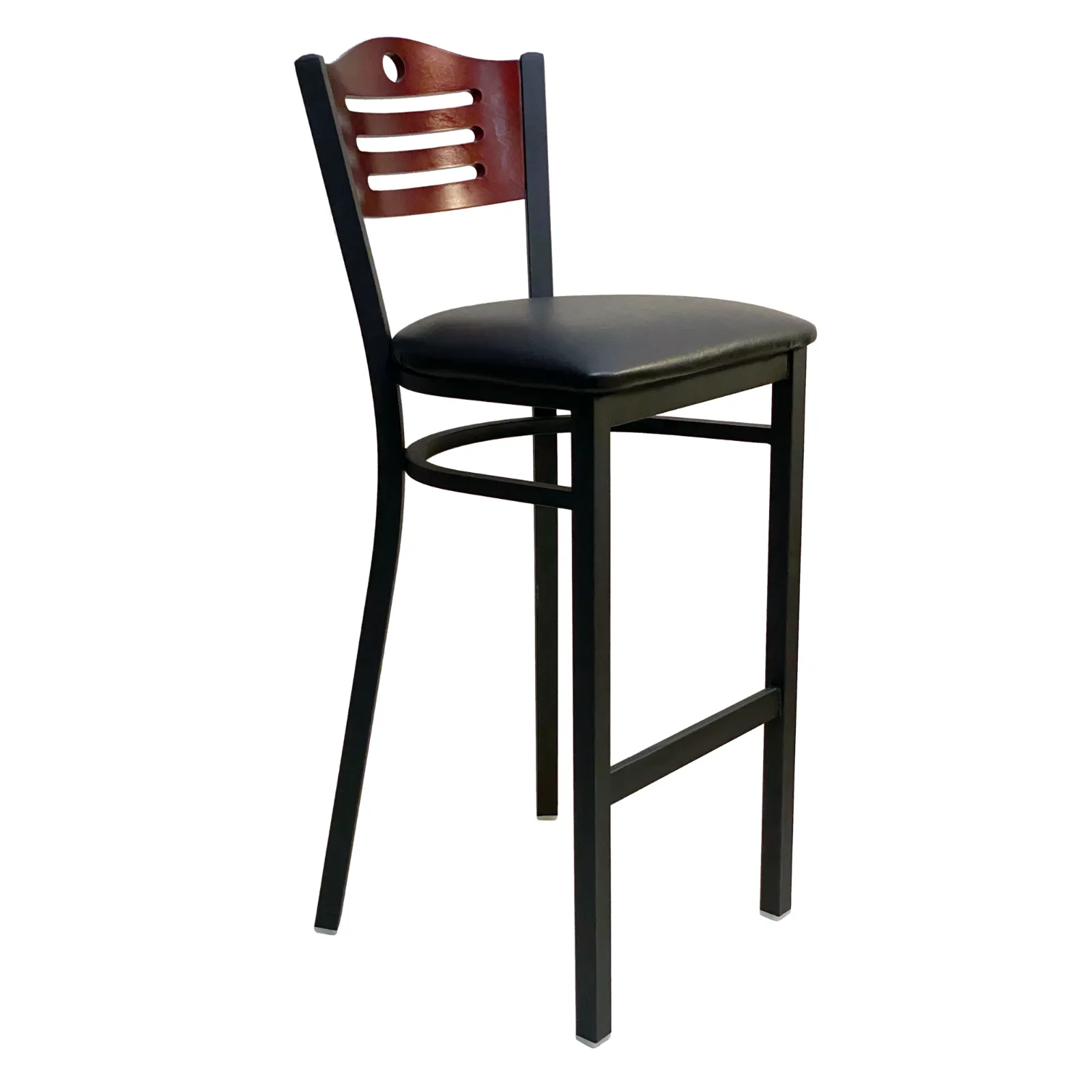 Bar Stool, wood back with slots and hole cutout, upholstered seat, metal frame with matte black finish, footrest, black vinyl, Quick Ship