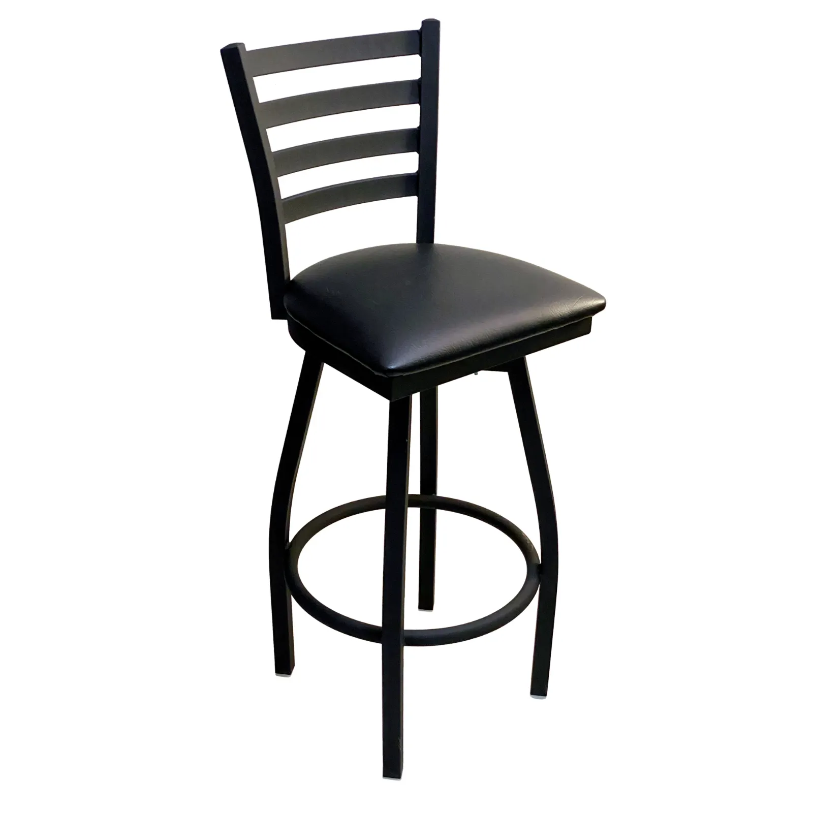 Swivel Bar Stool, ladder back, upholstered seat, metal frame with matte black finish, black vinyl, Quick Ship