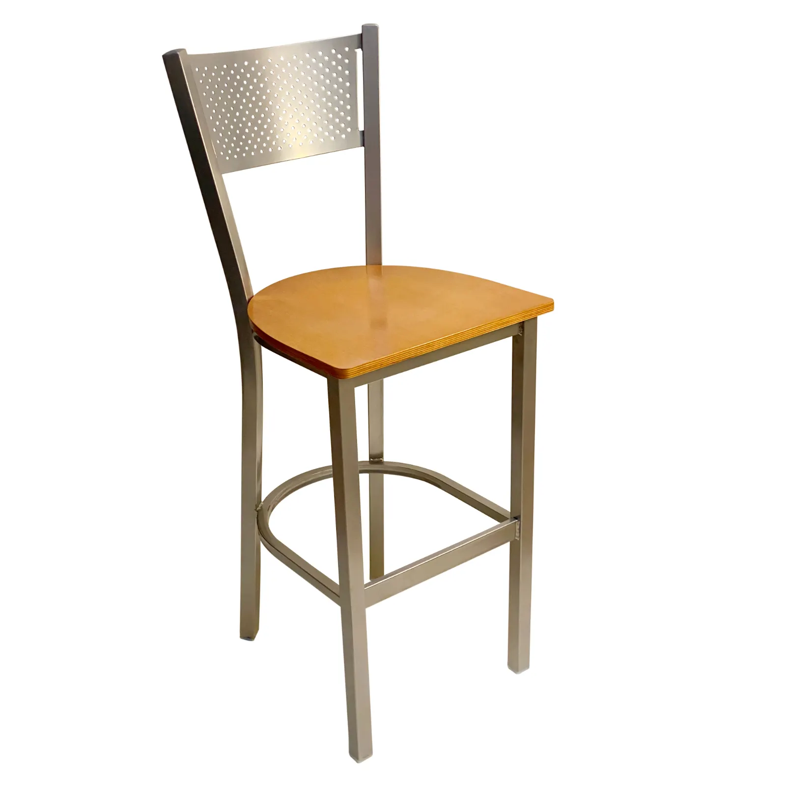Bar Stool, mesh back, wood saddle seat, metal frame with silver finish, footrest, Quick Ship
