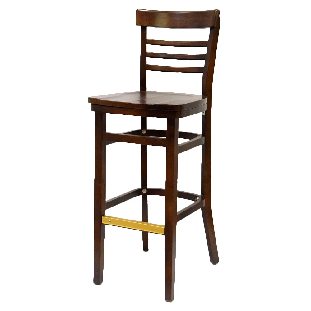 Bar Stool, ladder back, wood saddle seat, wood frame, footrest with gold foot cover, Quick Ship,