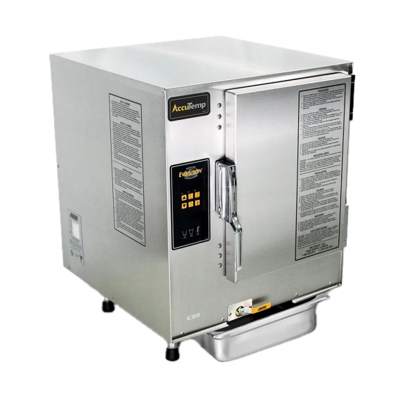Evolution™ steamer is AccuTemp Products’ connectionless, boilerless steam cooker that utilizes AccuTemp’s Patent Pending Steam Vector Technology for faster cook times, improved energy efficiency, better pan to pan uniformity. Steam Vector Technology requires no moving parts inside the cooking chamber. Steam to be produced inside the cooking cavity with no heating element exposed to water. No water or drain line. Unit to include low water, high water, overtemp warning lights and auto shut off feature. Evolution™ to include heavy duty, field reversible door. Standard digital controls with independent timer. No water quality exclusions to warranty and no water filtration or treatment required. Unit to be UL Safety and Sanitation Certified, and Energy Star qualified. Built in USA.