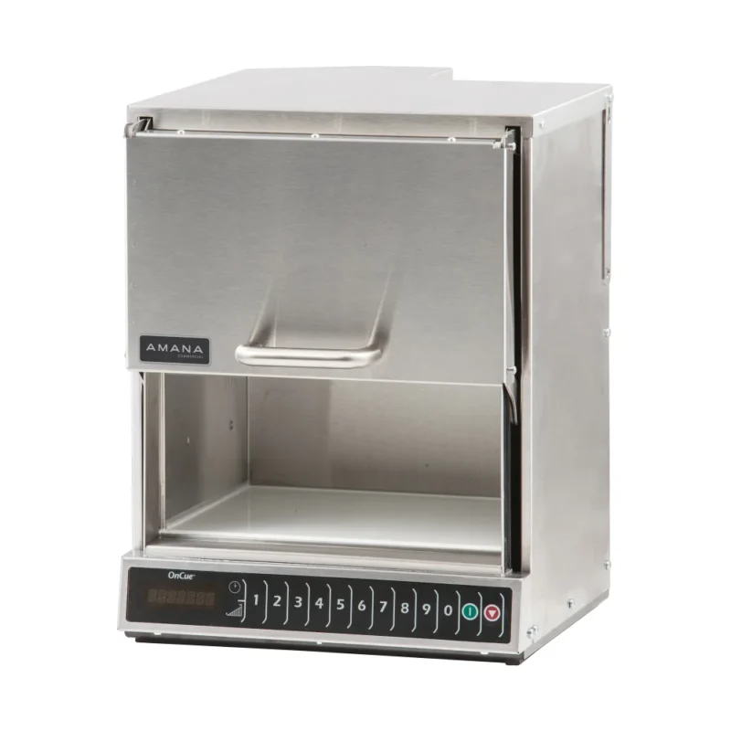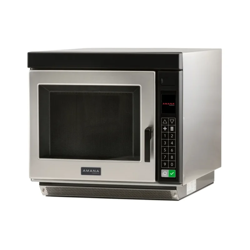 Amana® Commercial Microwave Oven, 1.2 cu. ft. capacity, 1000 watts, medium volume, 10-min. dial timer, (4) power levels, non-removable air filter, side hinged door with tempered glass, accommodates 14″ plate, stainless steel exterior & interior, 120v/60/1-ph, 13.0 amps, 15 MCA, 1550 watts (total), NEMA 5-15P, cETLus, ETL-Sanitation