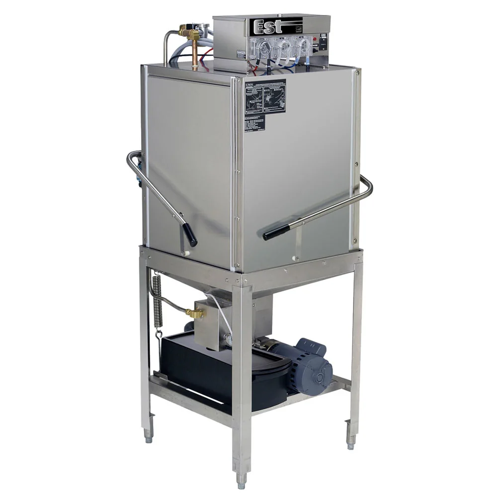 The CMA Dishmachines EST-C-EXT low-temperature dishwasher has a delimer system to ensure that cleaning chemicals are working efficiently and to reduce the buildup of limestone over time. Designed with a special sanitizing system, this unit eliminates the potential for chlorine damage to the interior. Because the control panel is mounted to the top, this unit can be placed anywhere without potentially blocking important valves, and for ease of use, it features an automatic start and stop function.