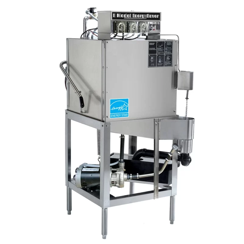 The CMA E-C-EXT Energy Mizer® low-temp dishwasher has a 90-second total cycle with a 45-second wash and rinse cycle; dwelling takes around 30 seconds. In an hour, it washes 40 racks or 160 covers, and it can accommodate one 20-inch standard rack. To fit most wares, the door opening has a 201/2-inch-tall maximum clearance to fit most wares.