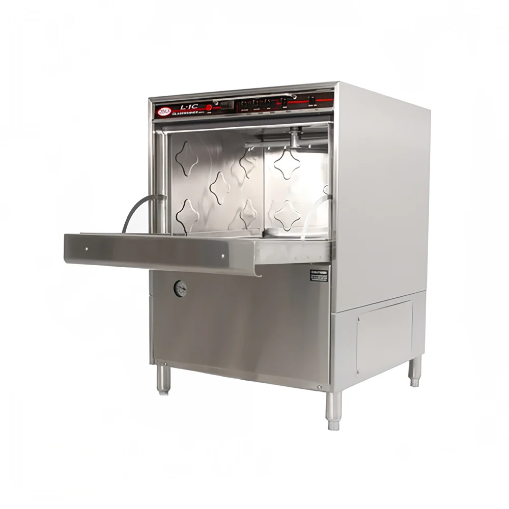Energy Mizer® Glasswasher, undercounter, 24″W x 24″D x 35″H, low temperature chemical sanitizing, double-wall stainless steel construction, (30) racks/(120) covers per hr., 11″H door clearance, “Noise Suppression Technology”, upper & lower wash arms with reinforced end caps, wash tank heater, built-in chemical pumps, pumped drain, pump purging & deliming system, water inlet with built-in strainer, 4″ legs, includes: (1) flat & (1) peg dishrack, 1 HP wash pump, 11.0 amps, 115v/60/1-ph, NSF, cULus