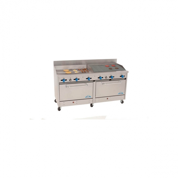 Range, gas, 72″ wide, (1) 36″ raised – 3/4″ thick griddle with manual controls, (1) 36″ char-broiler, stainless steel radiants, (2) extra wide 31″ ovens with enamel bottom & door lining, stainless steel exterior with high shelf, 6″ stainless steel legs, welded frame, 2″ clearance rating, 195,000 BTU, NSF, ETL