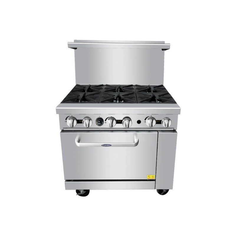 Gas Range, 60″W, 10 burners, stainless steel exterior including front, back sides, kick plate, back guard and over shelf, 12” X 12” removable cast iron top grates, oven temperature range (175°F to 500°F), 3/4” NPT rear gas connection, enamel interior oven, 6″ casters, CSA-Sanitation, cCSAus