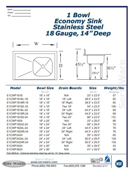 HomeShopOne Compartment SinkServ-Ware E1CWP3024 35″ One Compartment Sink, 30″W x 24″L Bowl Without Drainboards/18 Gauge