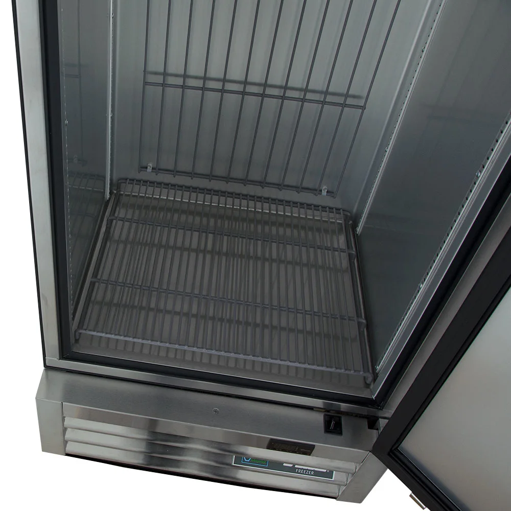 The True T-12F-HC one-section reach-in freezer uses a capillary tube system and R290 hydrocarbon refrigerant to keep cabinet temperatures around -10 degrees Fahrenheit, which is ideal for holding both ice cream and frozen foods. Large fan blades move high volumes of air through the cabinet to ensure all products are evenly chilled. The condensing unit is mounted at the bottom for accessibility. To save energy, an automatic defrost system turns on at a set time and turns off after the ideal temperature is reached.