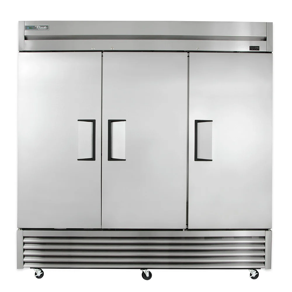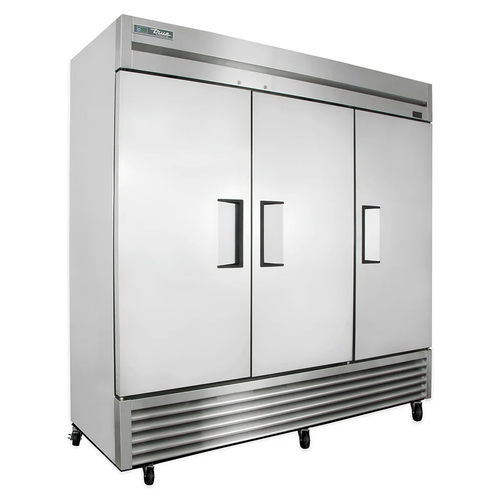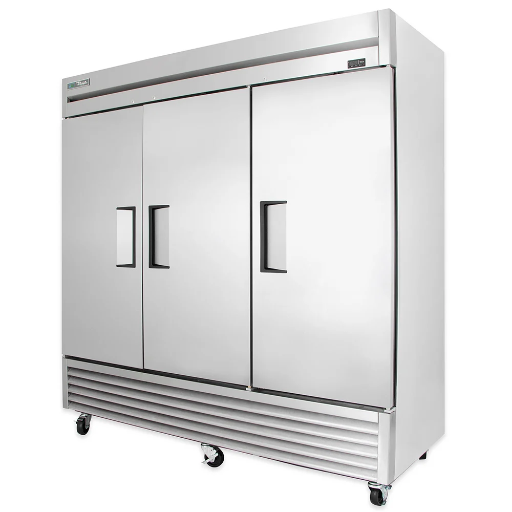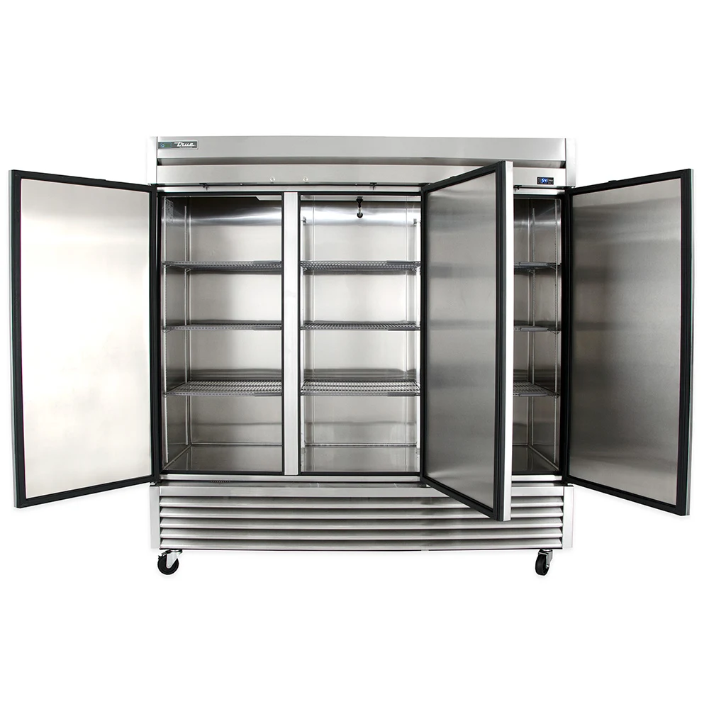 The True T-72-HC three-section refrigerator is built with a powerful compressor and large evaporator and condenser coils to maintain cabinet temperatures between 33 and 38 degrees Fahrenheit. A self-contained capillary tube system in the unit holds and controls the flow of R290 hydrocarbon refrigerant. For movement, 4-inch-diameter stem castors are bottom mounted and the front set locks for stability. Each door has a magnetic gasket that snaps into the frame to prevent cold air from seeping out.