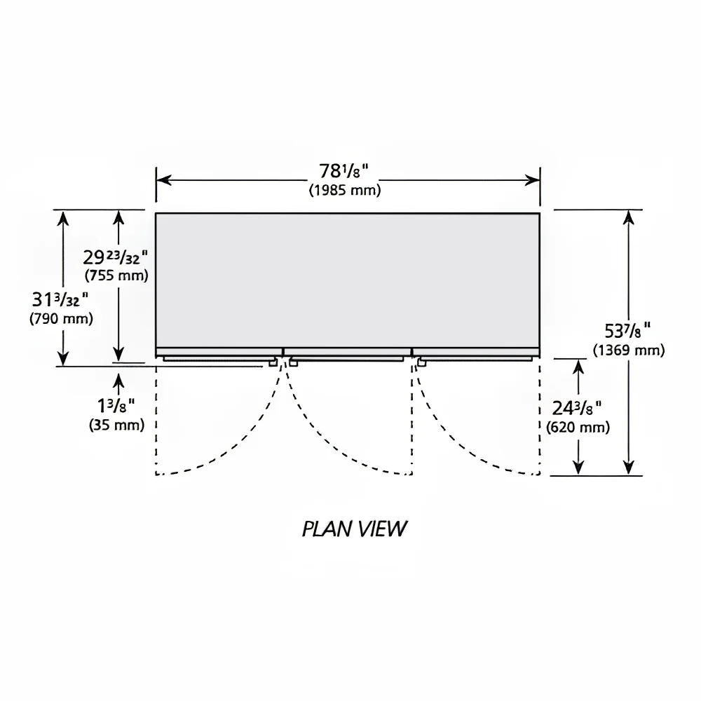 True 78 1/10″ Three Section Reach In Refrigerator, (3) Left/Right Hinge Glass Doors, 115v