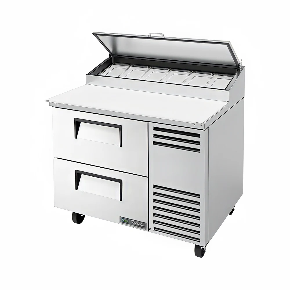 For pizzerias and Italian restaurants, the True TPP-AT-44D-2-HC prep table is designed for pizza making, accommodating ingredients to top pizzas in the pan rail section with six third-size pans. Product from these pans can be added to pizzas sitting on the full-length cutting board, and storage space for more product is available in the base, which is made up of two drawers. Each drawer has a 12-inch-long handle and can accommodate two 12-inch by 20-inch by 8-inch-deep pans.