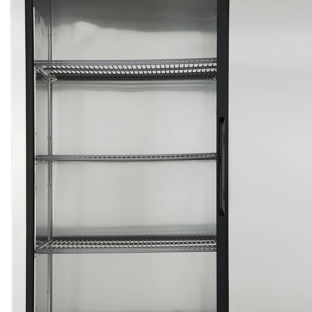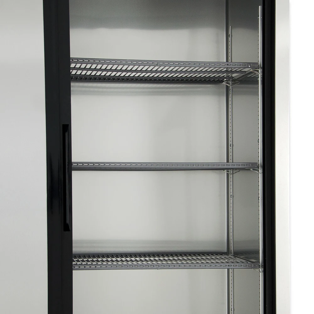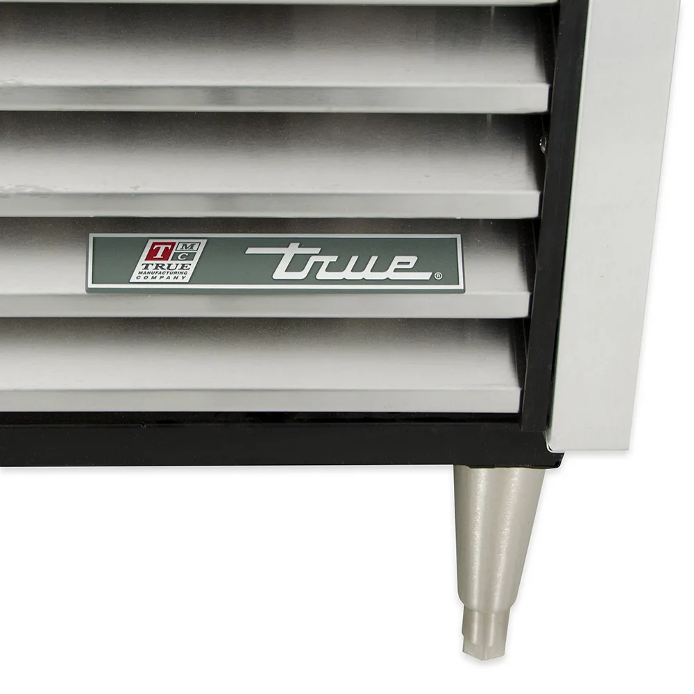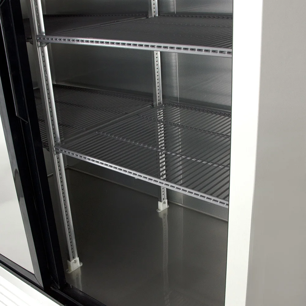 For durability, the True TSD-47-HC TSD series reach-in refrigerator has a dent- and corrosion-resistant exterior, consisting of stainless steel, anodized aluminum, and GalFan-coated steel. Its steel frame rail is heavy duty to prevent bends and warps, while polyurethane insulation is foamed in place to resist sagging. To ensure smooth operation, the two doors slide on stainless steel bearings and close by themselves to prevent cold-air loss. Inside, products are illuminated by LED lighting and supported on six shelves that can be adjusted in 1⁄2-inch increments. These shelves are coated with PVC for strength and rust resistance, and product can also sit on the floor, which is made of stainless steel that is quick to clean in case of leaks.