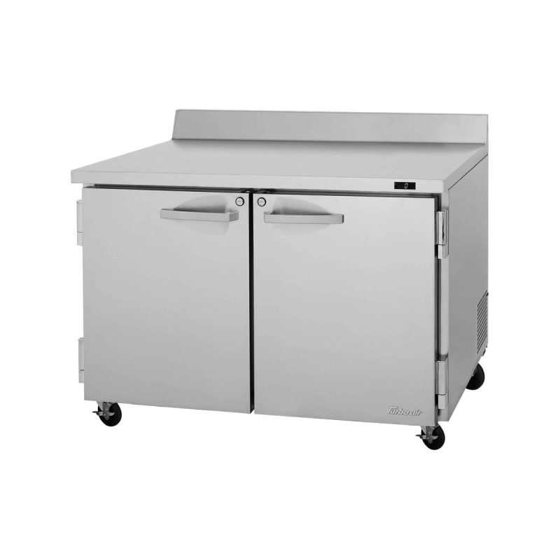 Two PVC-coated, wire shelves are adjustable in 1⁄2-inch increments and include four chrome-plated clips apiece. The True TWT-44F-HC worktop freezer has a positive-seal door, which swings within cabinet dimensions. Its 12-inch-long, recessed handle is foamed in place with a sheet metal interlock to ensure permanent attachment. Magnetic door gaskets are made from one piece, so they can be remove and cleaned efficiently. This stainless steel unit features a GalFan-coated, steel back designed to protect the unit from corrosion, and the interior is lined with clear-coated aluminum for durability. The interior is foamed in place with high-density polyurethane insulation and features coved corners. The backsplash prevents debris from slipping off the top and underneath the unit. This freezer has a work surface height of 36 inches and lockable, 5-inch stem castors.